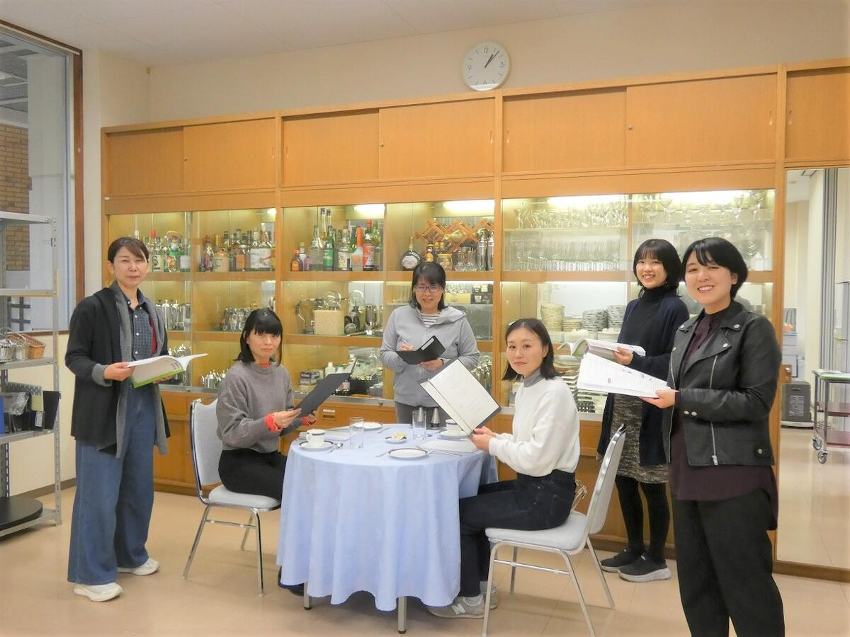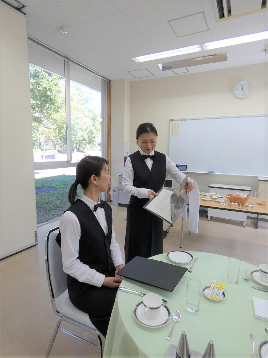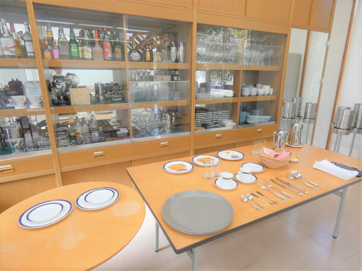 テーブルセッティングや料理のサービス、お皿の取り扱い方などを、実際のレストランで使われる器具を用いて学びます。
