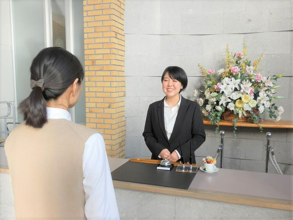 お出迎え、荷物の運び方、チェックイン・アウトの対応、客室案内などフロント業務に必要な技術を、本物のホテルフロントを模した施設を利用し実践形式で学びます。