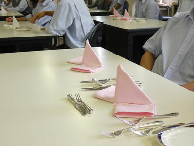 食事のマナーとは何か、西洋料理マナーの基本、コース料理についての講義とナプキン、フォーク、ナイフなどを使った、テーブルセッティング等を実践形式で学んでいただきました。