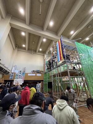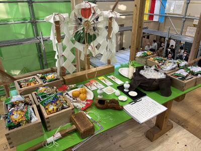 上棟式では、祝詞をうたいあげ、製作の安全を願い、学生が餅や菓子などをまき、家を建てる際の厄災を払いました。